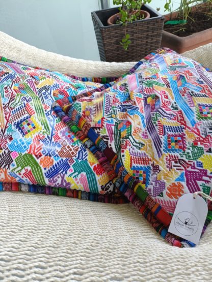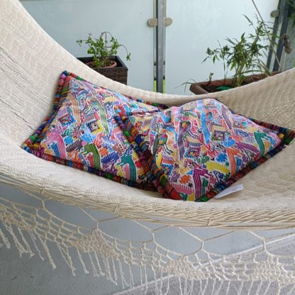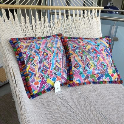 Im Gegensatz zu den Textilien unserer weichen Stoffhängematten wird der feste und weiche Maya Huipil (Stoff Broderie) unseres Kissens in Guatemala handgewebt. Die einzigartige Farbvielfalt ist das Geheimnis der Maya aus diesem vulkanischen Land.