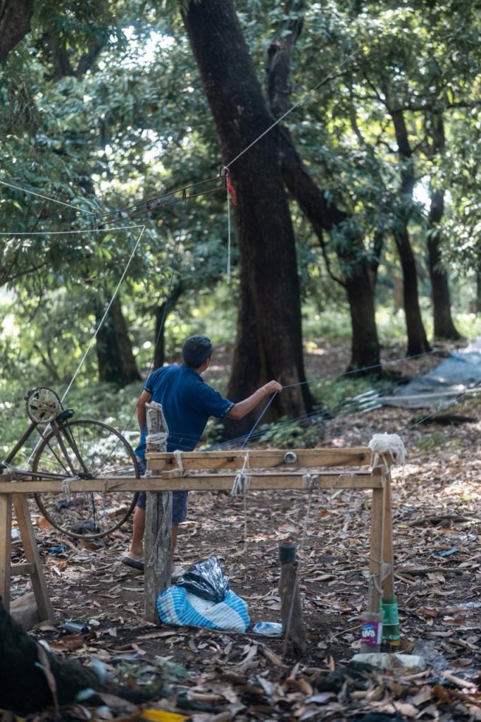 Alfonso préparant le fil de nos hamacs sur son terrain d’Escuintla