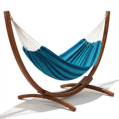 The hammock, made from traditional sedalina (cotton with nylon), features stunning turquoise and green shades. Its unmatched softness and extra width make it perfect for naps, reading, or simply relaxing. In this large version, three fabric strips are stitched together in a traditional arrow pattern by Mayan craftswomen, ensuring both strength and elegance. The Latino Relax L stand, crafted from outdoor-treated larch wood, guarantees stability and long-lasting durability. Its generous size is perfectly suited for large fabric hammocks.